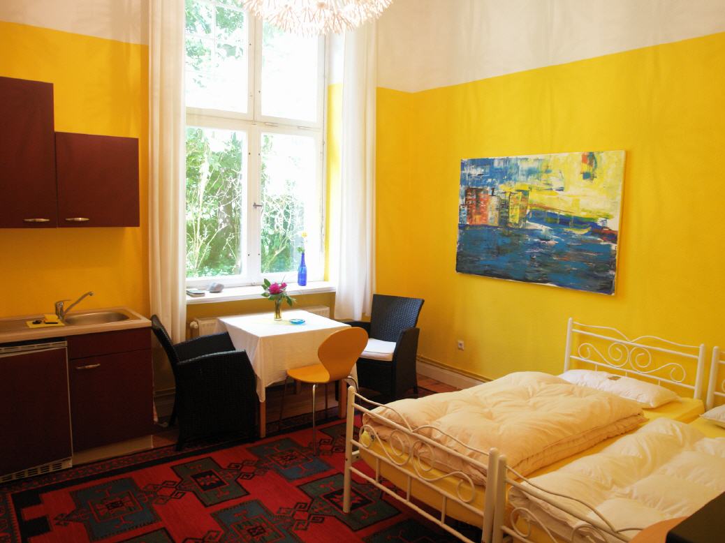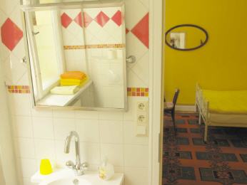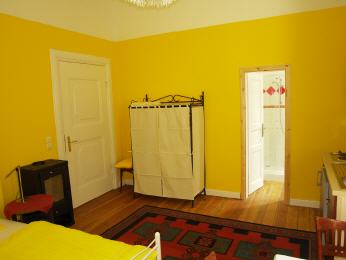 Der Wohn-/Schlafraum ist in hellem Gelb, das Bad in Weiss gehalten. Beide Räume sind mit Pitchpine-Dielen ausgestattet.