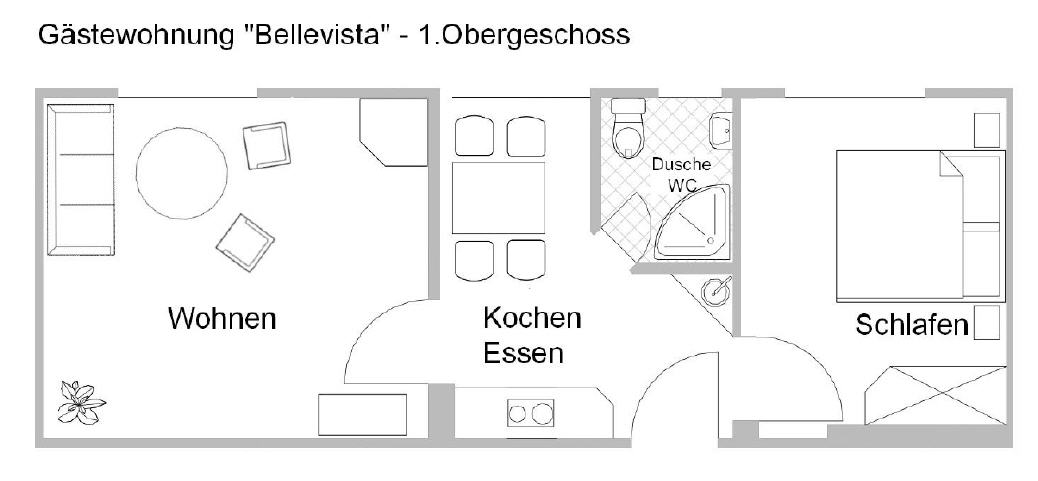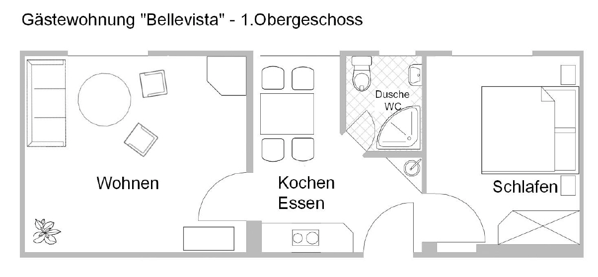 Die Suite 'bellavista' (ca. 50 qm) besteht aus einem Wohnraum mit großem blauen Sofa, das ggf. auch zum Schlafen genutzt werden kann, einer Küche mit Essbereich, einem Schlafzimmer mit Doppelbett und einem modernen stilvollen Bad.