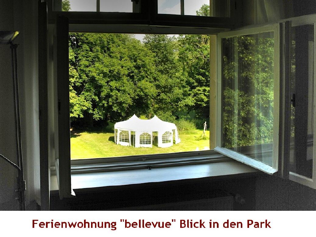 Die Suite liegt im ersten Obergeschoss, von den großen Fenstern aus hat man einen wunderschönen Ausblick in den Park und auf den Teich.