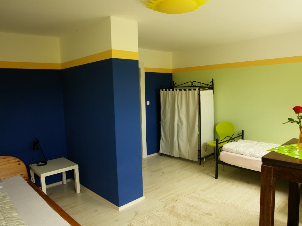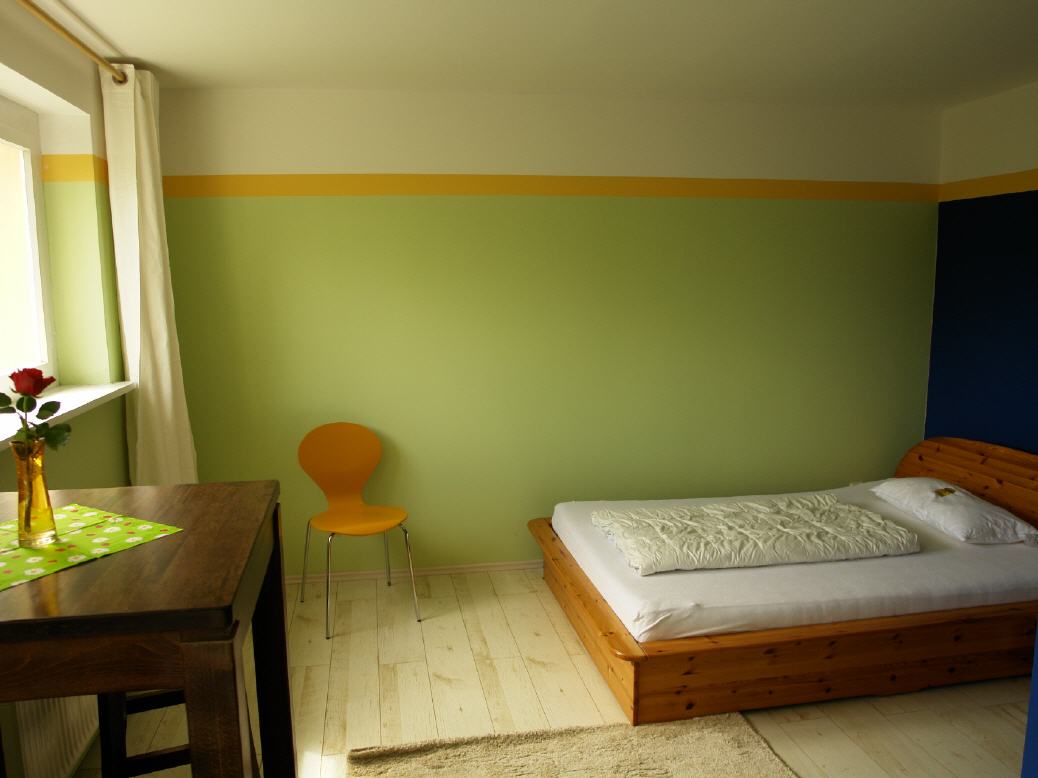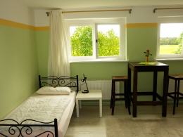 Das Turmzimmer (ca. 20 qm) besteht aus einem hellen Raum mit zwei großen Fenstern, mit Einzel- oder Französischem-bett.