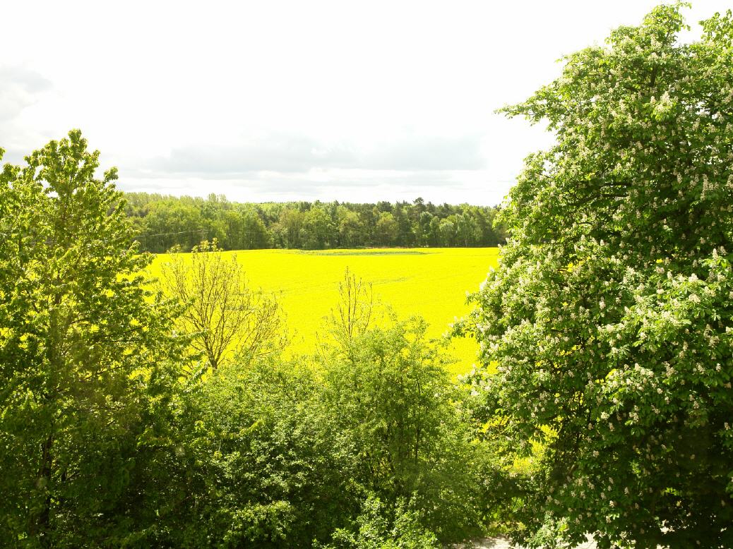 Die Philosophenzimmer liegt im Dachgeschoss, von den großen Fenstern aus hat man einen wunderschönen Ausblick auf die Felder.